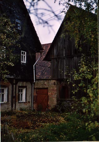 La fattoria Buscha n. 11 e´ una piccola corte su quattro lati, struttura tipica dell´area in cui e´situata (vicino Altemburg, Turingia - Germania). Gli edifici, a pareti intelaiate, sono stati costruiti a partire dal principio del XIX secolo. La casa colonica (nella foto a destra) ha un´ iscrizione che riporta la data 1811. Nelle originarie stalle (nella foto al centro) e´ incisa la data del 1819. La data di realizzazione del grande fienile(nella foto a sinistra) non e´ leggibile perche´ per lo piu´ occultata sotto l´ attuale intonaco. L´ originario porcile, l´ edificio da cui e´stata scattata la foto, e´stato completamente trasformato nel 1970. Attualmente ospita due appartamenti al primo piano e cantine e magazzini al piano terra. L´originaria struttura a pareti intelaiate, se ancora in parte esistente, non e´ visibile perche´ i muri sono intonacati. Nonostante la pesante trasformazione subita da una parte della fattoria, gli edifici continuano a formare con la loro volumetria un insieme armonico e la struttura a corte e´ ancora evidente.