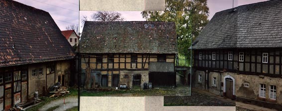 La fattoria Buscha n. 11 e´ una piccola corte su quattro lati, struttura tipica dell´area in cui e´situata (vicino Altemburg, Turingia - Germania). Gli edifici, a pareti intelaiate, sono stati costruiti a partire dal principio del XIX secolo. La casa colonica (nella foto a destra) ha un´ iscrizione che riporta la data 1811. Nelle originarie stalle (nella foto al centro) e´ incisa la data del 1819. La data di realizzazione del grande fienile(nella foto a sinistra) non e´ leggibile perche´ per lo piu´ occultata sotto l´ attuale intonaco. L´ originario porcile, l´ edificio da cui e´stata scattata la foto, e´stato completamente trasformato nel 1970. Attualmente ospita due appartamenti al primo piano e cantine e magazzini al piano terra. L´originaria struttura a pareti intelaiate, se ancora in parte esistente, non e´ visibile perche´ i muri sono intonacati. Nonostante la pesante trasformazione subita da una parte della fattoria, gli edifici continuano a formare con la loro volumetria un insieme armonico e la struttura a corte e´ ancora evidente.